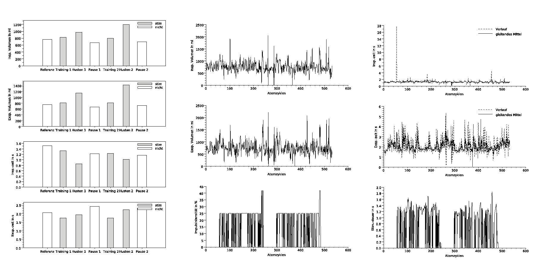 Die Bedienoberfläche wurde in enger Absprache mit dem ukb entworfen und iterativ an die Bedürfnisse der Ärzte und Therapeuten angepasst. Abbildung 4 zeigt beispielhaft die Bedienoberfläche während einer Trainingsphase. Im Stimulator werden während des Trainings alle relevanten Stimulations- und Atemparameter aufgezeichnet (Abbildung 5) und nach Abschluss jedes Trainings auf einem externen USB-Speicher abgelegt. Ferner wurde eine PC-Software entwickelt, welche aus diesen Daten Protokolle im PDF-Format (Abbildung 6) generiert.